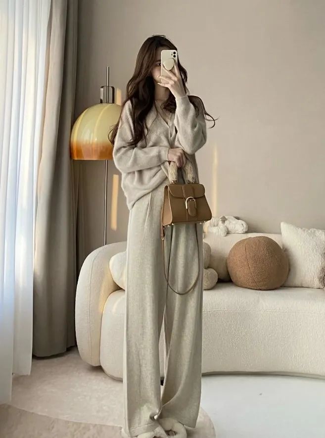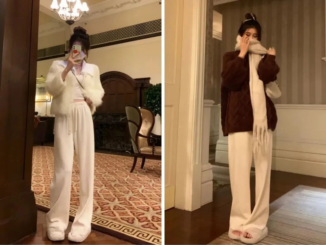 想要走温柔路线的,可以白色糯米裤,搭配短外套和中长款毛衣都很有温柔美女氛围,舒服又暖和。