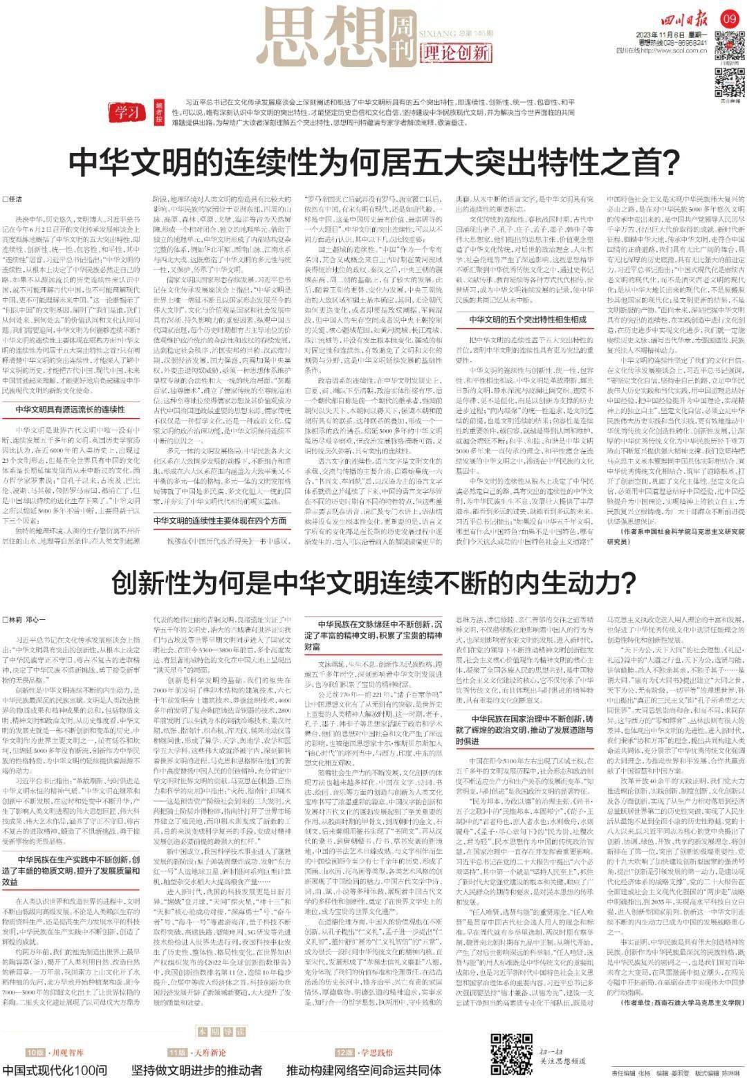 泱泱中华,历史悠久,文明博大。习近平总书记在今年6月2日召开的文化传承发展座谈会上高度凝练地概括了中华文明的五大突出特性,即连续性、创新性、统一性、包容性、和平性,其中“连续性”居首。习近平总书记指出:“中华文明的连续性,从根本上决定了中华民族必然走自己的路。如果不从源远流长的历史连续性来认识中国,就不可能理解古代中国,也不可能理解现代中国,更不可能理解未来中国。”这一论断揭示了“何以中国”的文明基因,阐明了“我们是谁,我们从何处来、到何处去”的价值认同和文化认同问题。我们需要追问,中华文明为何能够连续不断?中华文明的连续性主要体现在哪些方面?中华文明的连续性为何居于五大突出特性之首?只有阐释清楚中华文明的突出连续性,才能深入了解中华文明的历史,才能把古代中国、现代中国、未来中国贯通起来理解,才能更好地肩负起建设中华民族现代文明的新的文化使命。