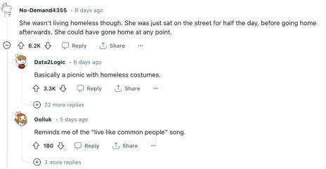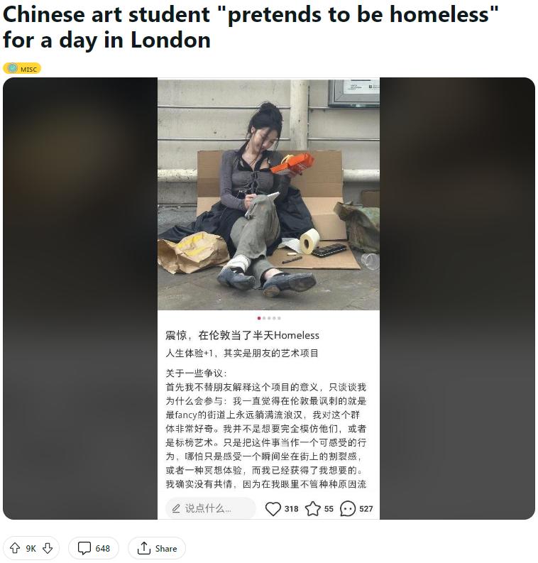 诸多外国网友表示,这就是一场作秀——“她并不是过着无家可归的生活。她只是在街上坐了半天,然后才回家。她随时都可以回家。”
