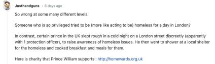 甚至有网友举出了真正有心做公益的威廉王子为了提高大众对homeless问题的关注,不仅在伦敦大街上睡了一个晚上,随后更是前往当地的无家可归者收容所洗澡,并为他们烹饪早餐和其他餐食。