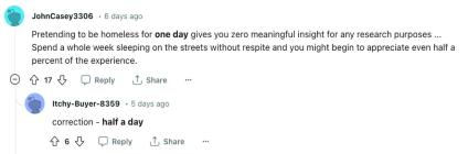 (source:reddit)国外网友们更是从研究角度对这个行为进行批评,称“只是假装homeless一天根本无法对研究有实质性帮助。” 而后甚至有网友辣评——修正:是半天。