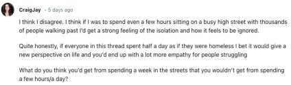 (Source:reddit)但也有少数支持的声音出现,认为这样的行为确实能给人带来一些震撼和不一样的体验,比如这位网友就表示:“说实话,如果这个讨论组里的每个人都花半天时间过上无家可归者的生活,我敢打赌这将为生活带来新的视角,你们最终会对那些正在挣扎的人有更多同情心。”