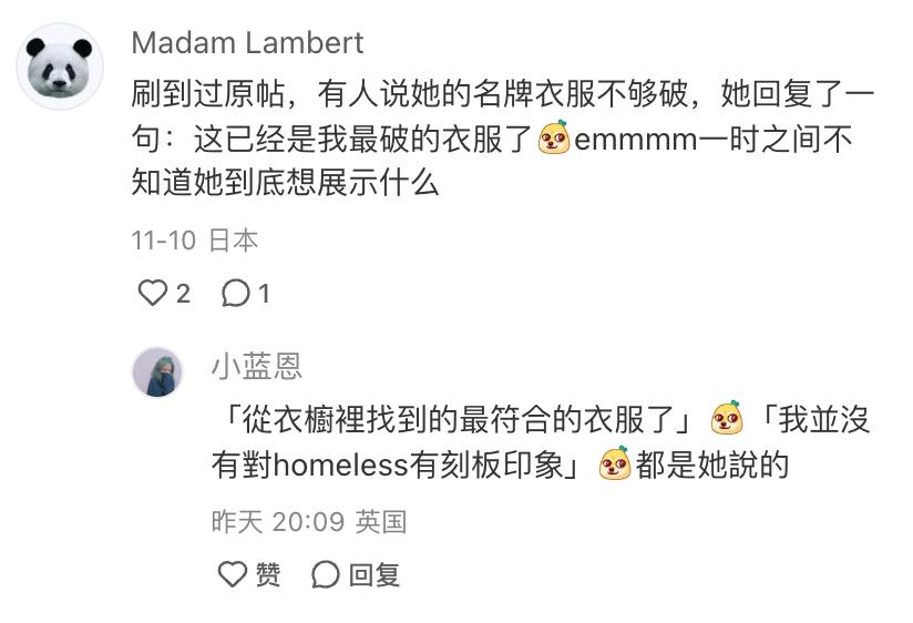 (source:小红书)当然,国内网友中较为温和的一派则表示,可能是博主没有解释清楚自己到底做了什么,如果说清楚了会减少很多误会,如果只是和流浪汉聊聊天,那穿着打扮大可不必被指责。如果博主能够进一步展开说一些自己的思考,也不会引来如此谩骂。