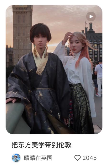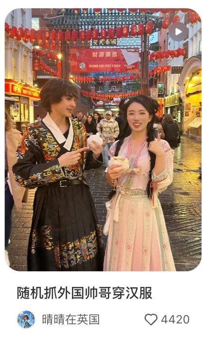 (source:小红书)然而不可否认,晴晴的一些文化传播视频, 确实一定程度上宣扬了中华传统文化,比如把东方美学带到伦敦、带外国帅哥体验汉服文化。