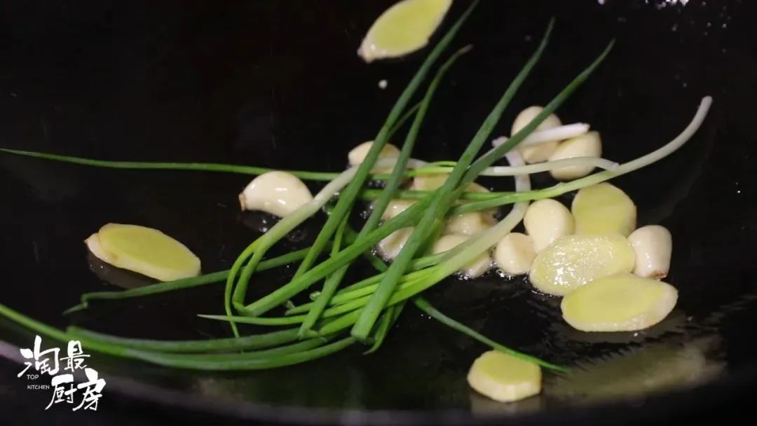 开中火,锅中放2调羹(30g)油,油温至五成,放入葱姜蒜,进行翻炒。