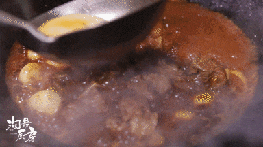 焖煮完成后,加入0.5茶匙(3g)盐、1茶匙(6g)生抽、0.5茶匙(3g)老抽和1调羹(15ml)水淀粉,勾芡调味。
