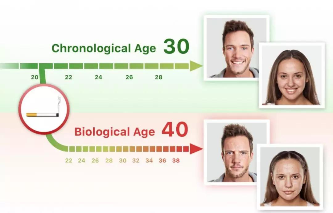 除此之外,美国一个研究癌症和衰老的团队曾发表了这么一项调研结果:吸烟会加速人的衰老,尤其是实际年龄在40岁以下的年轻人。抽烟女性的生理年龄是实际年龄的2倍;抽烟男性的生理年龄也是实际年龄的1.5倍。