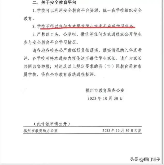 网传文件显示,2023年10月30日,福州市教育局办公室发布通知,关于安全教育平台提到了3点,其中提到:“学校不得以任何方式要求学生或家长完成学习任务。 ”