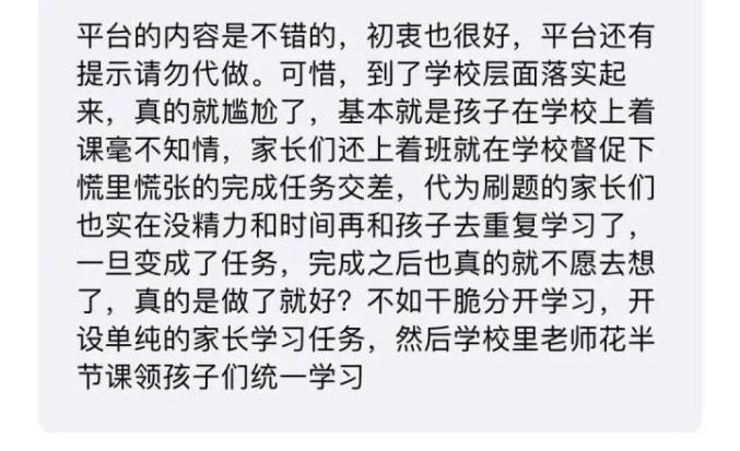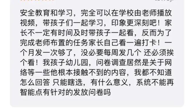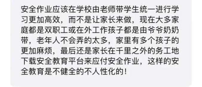 在网络上,也有很多关于安全教育平台的讨论,有家长说:“我都看了十年的安全教育平台,做了十年的学生作业……”也有家长说:“安全教育平台,本就是给孩子看的,孩子接受度很高,让孩子看比你跟他说100遍都有用。那些家长打卡的,根本没意识到,只当完成一个任务,没有发现它的好处。”