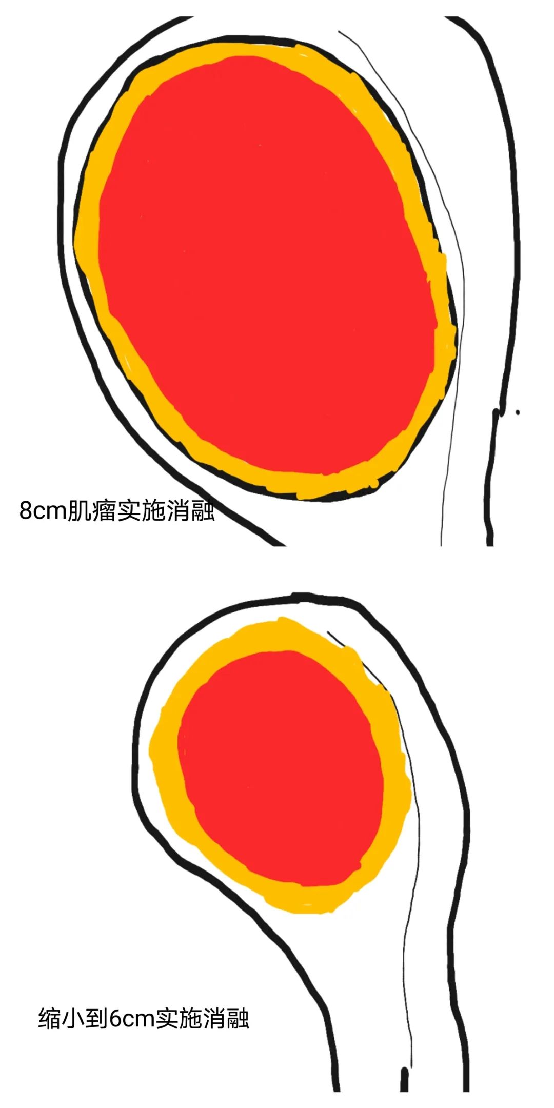 打闭经针GnRH-a的作用是为了让病灶萎缩、血供减少,打针以后肌瘤或腺肌症病灶对消融会更加敏感,但是无论是一个8cm的子宫肌瘤还是打针萎缩到6cm的子宫肌瘤,我们在消融治疗过程中,都需要在肌瘤的周边保留2-10mm左右的边界,避免能量传导出去损伤周边组织。假设我们通过消融,肌瘤内部发生坏死(红色区域),在周边都保留0.4cm左右的边界(黄色区域),那么8cm肌瘤的消融范围是8-0.4-0.4=7.2cm,消融率会是(7.2*7.2*7.2)/(8*8*8)=72.9%,而假设肌瘤通过打针缩小到了7cm,消融范围7-0.4-0.4=6.2,消融率会是(6.2*6.2*6.2)/(7*7*7)=69.5%,而若是缩小了6cm,消融率则是(5.2*5.2*5.2)/(6*6*6)=65.1%。换句话来说,当病灶缩得越小的时候,相对消融率越低,消融率越低,病灶再长起来的机会就越高。上述问题其实本质上是一个数学问题。
