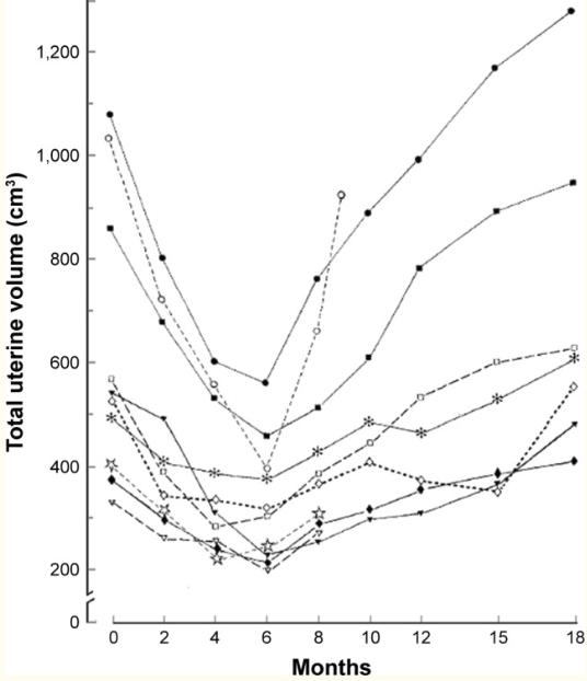 使用后的确给子宫肌瘤的药物治疗带来了巨大的希望,特别是一些临近绝经期的妇女,似乎就可以通过使用这类药物避免手术了?然而随着对临床使用的随访,发现在停药后会出现迅速的反弹,加上在使用期间的一些副作用,包括潮热、盗汗、情绪改变等更年期的症状,特别是骨质流失的影响,导致这类药物并不能长期使用,目前通常最长只建议连续使用6个月。