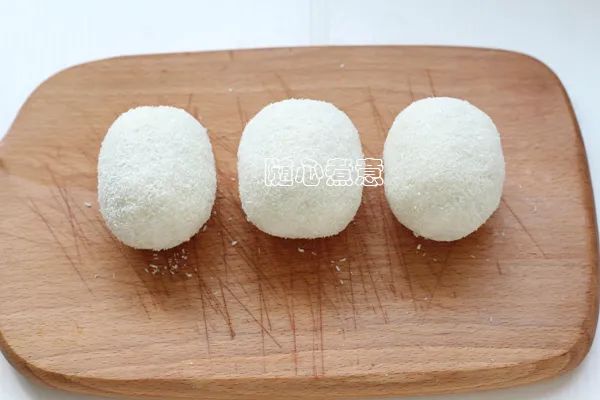 3.取三分一的山药泥搓圆按扁,包入一个猕猴桃,收口捏合,外面裹上一层椰蓉,用刀切成两半即可。