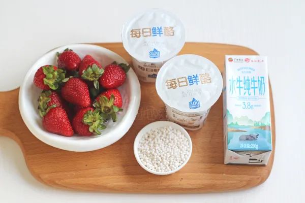 用料:草莓200克、酸奶200克、牛奶120克、西米30克、白糖15克。
