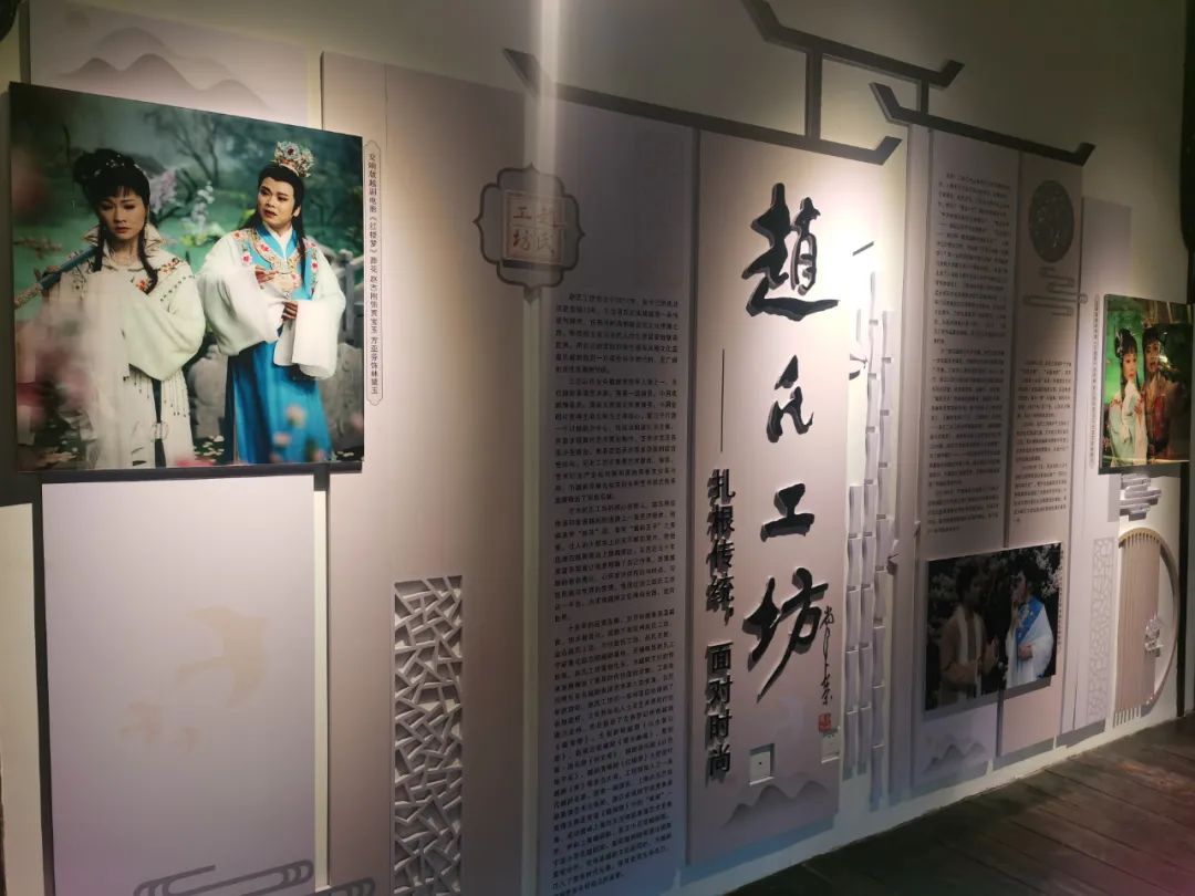 走进赵氏工坊,小桥流水、桃花灼灼,宝黛共读西厢的场景映入眼帘。跨过门槛,屋内中央设置了一张戏台,戏台一边陈列了中国越剧十六流派代表人物的简介展牌,另一边则是赵氏工坊当家人赵志刚从幼年开始的学艺旧照及舞台剧照。值得一提的是,赵志刚还将他在经典曲目《沙漠王子》中的剧服及配饰一同陈列。“落户泗泾后,我们将定期带来一系列的惠民演出,让市民近距离走进越剧、黄梅戏、沪剧等传统艺术。”赵志刚说,泗泾赵氏工坊每月还将举办各类展览供市民欣赏。