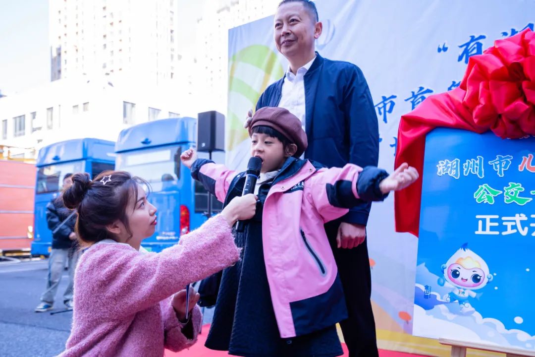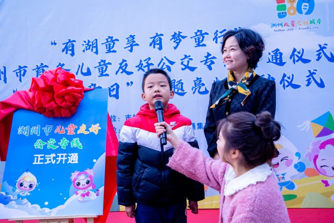 儿童观察团员代表宣布湖州市首条“儿童友好公交专线”开通仪式暨“世界儿童日”主题亮灯活动启动。