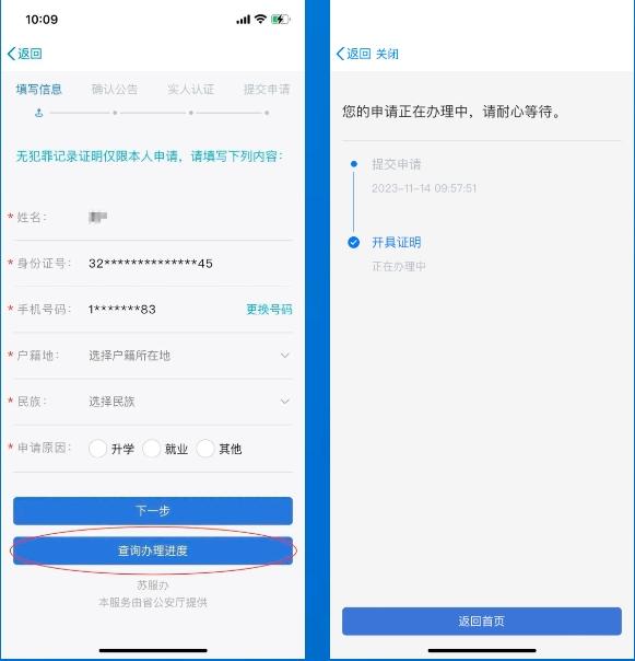 点击“查询办理进度”,可查询办理进度。