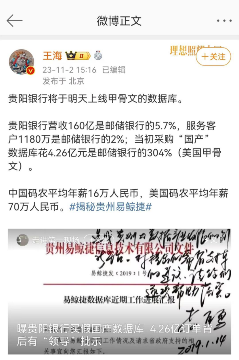 据公开资料显示,贵阳银行在2020年10月耗资4.27亿元以单一来源方式采购贵州易鲸捷国产数据库应用项目。值得注意的是,2022年11月,知名打假人王海发布了一篇关于数据库厂商易鲸捷“假招标、假国产”的文章,直指易鲸捷与贵阳银行之间的国产核心数据库投招标交易不规范,并称易鲸捷的国产数据库实际上是“盗窃”。