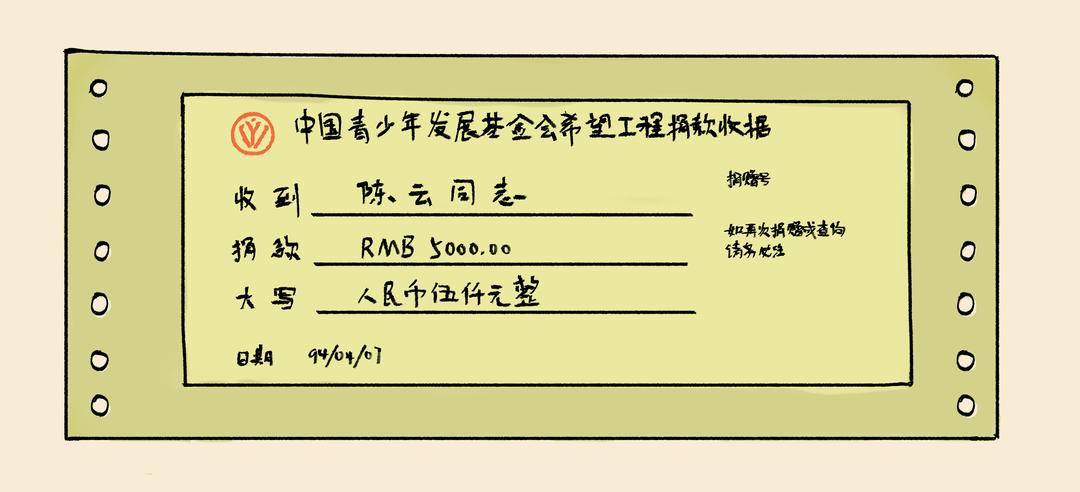 希望工程捐款收据从陈云的存款中取出5000元人民币送到了希望工程基金会,帮助了河南省卢氏县16名儿童