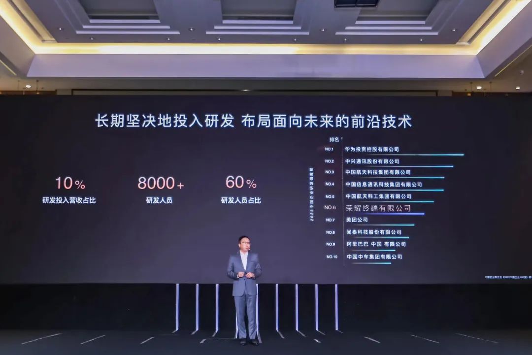 目前,荣耀的研发投入占公司收入的10%,去年则超过了10%,在北京、西安、深圳、南京、上海、东京、巴黎建立了7大研发基地、100多个创新实验室。13000 名员工中研发人员占比超过 60%,专利月申请量超过300个。研发投入强度在2022中国企业500强榜单中排第六,在手机消费电子品公司中排名第一。