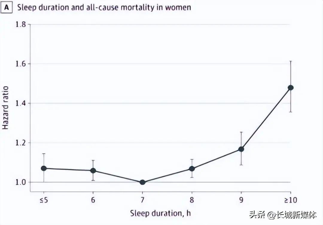 女性睡眠时长与全因死亡率的关系在女性中,与每晚7小时睡眠相比,多睡1小时或少睡1小时均会使全因死亡率升高。