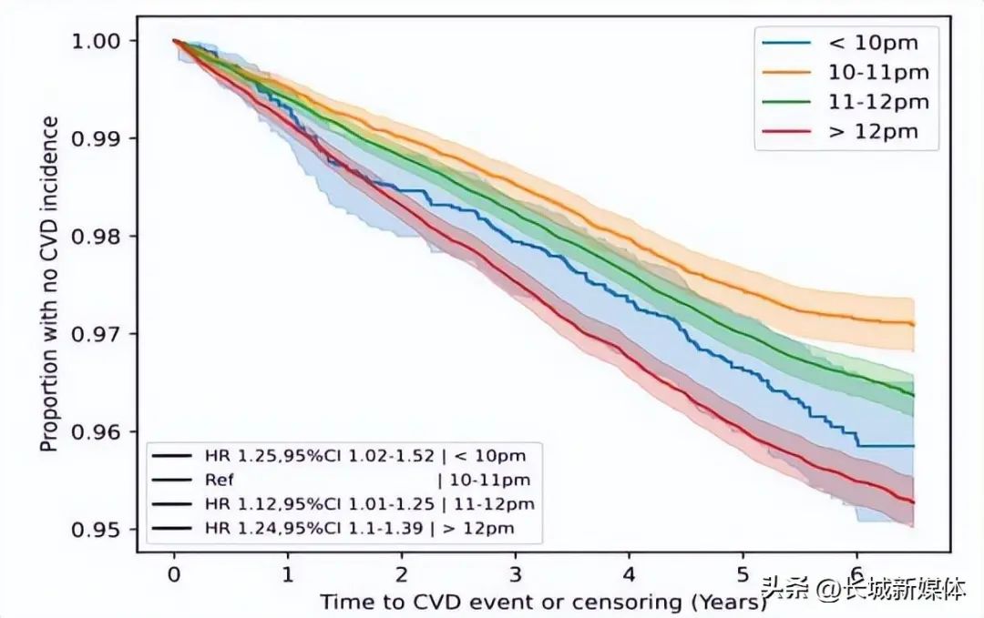 研究发现,入睡时间在午夜或更晚的人发病率最高,而在22:00-22:59 之间入睡的人患心血管疾病的风险最低。同样让人震惊的是,早于22时睡,患心血管疾病的风险也更高!