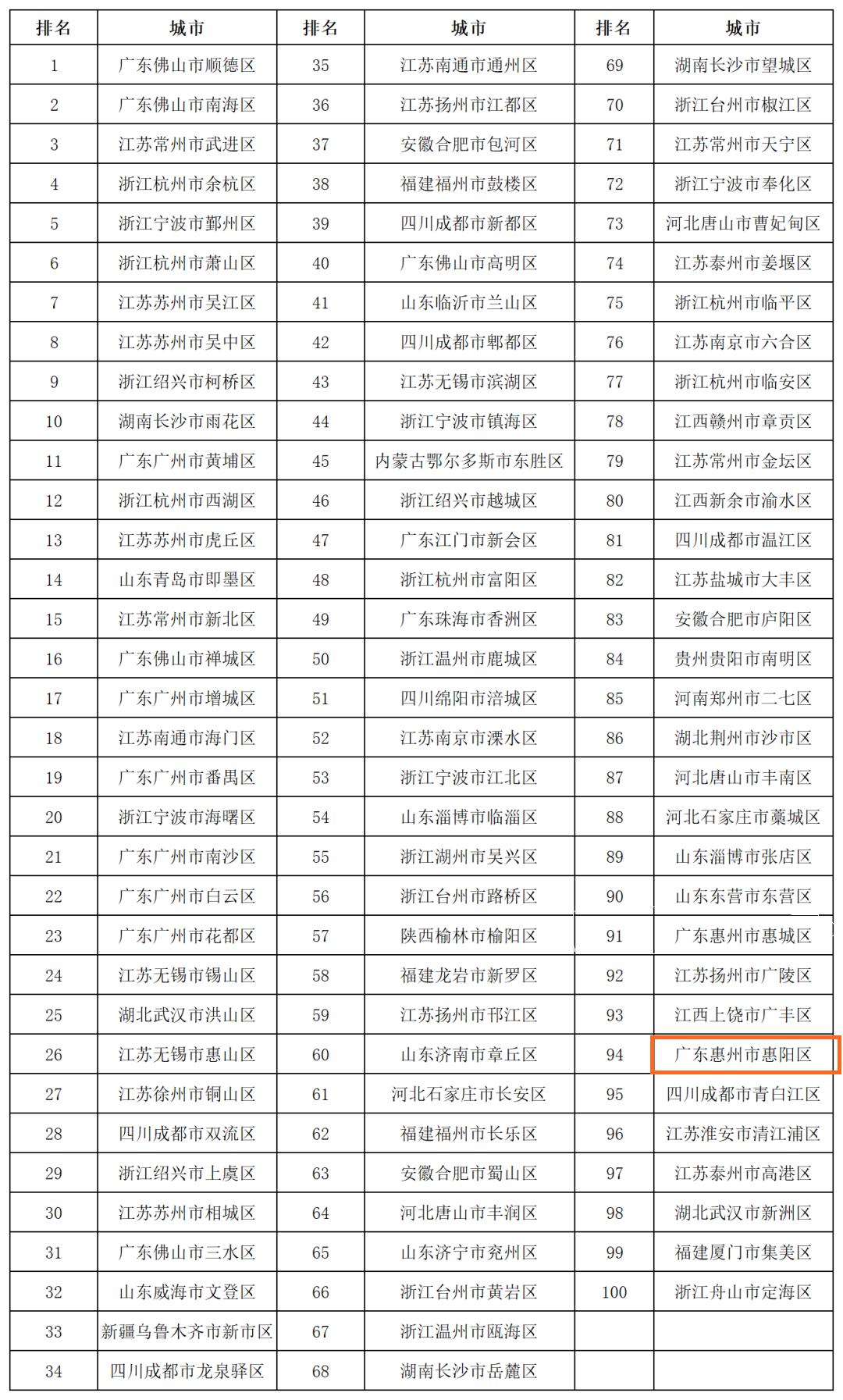 惠阳区获评全国综合实力百强区!2023全国百强县市区系列榜单发布