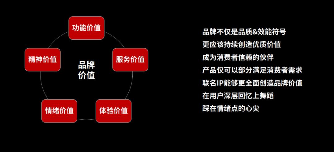 首先功能价值往往等同于产品价值。但是我们现在想要凸显出品牌在精神价值、情绪价值、体验价值、服务价值之中带给消费者的增值感受,作为一个品牌来讲,这种增值感受往往很难一次性全部实现。