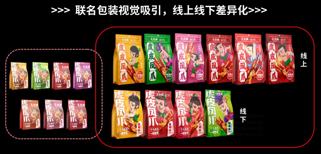 但对于线下来讲,我们一定要让产品包装更醒目,在一众花红柳绿之间能够脱颖而出。所以大家可以看到,线上版本的葫芦兄弟采用的是平面2D素描形式,但线下葫芦兄弟变得更大,虎皮凤爪几个字更凸显,葫芦兄弟的形象也是用3D立体的形式再打造,线下的整个堆头排面会非常的醒目。第一,联名内容要能够全面赋能天猫和抖音。在联名期间无论是官方旗舰店,还是抖音直播间,都会跟联名IP进行全面的结合,从而能够在大促期间吸引更多消费者的注意力,实现转化效率的提升。