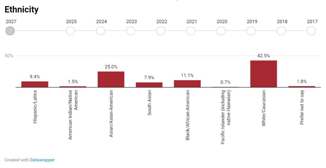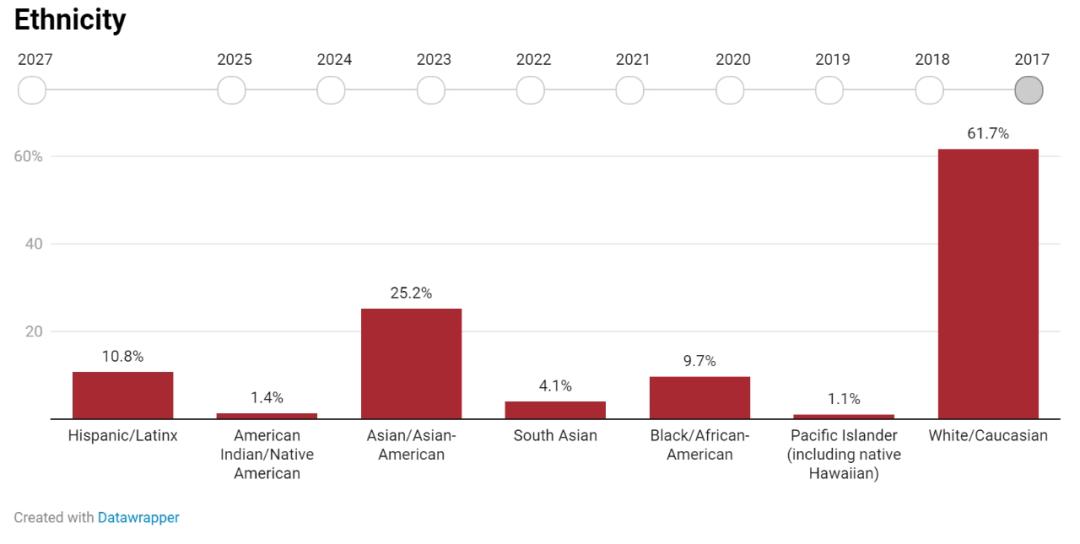 但值得注意的是,总览2017届以来的十年新生数据,亚裔、非洲裔、拉美裔的比例每年略有波动,但是白人学生的占比确实且明显地降低了不少。