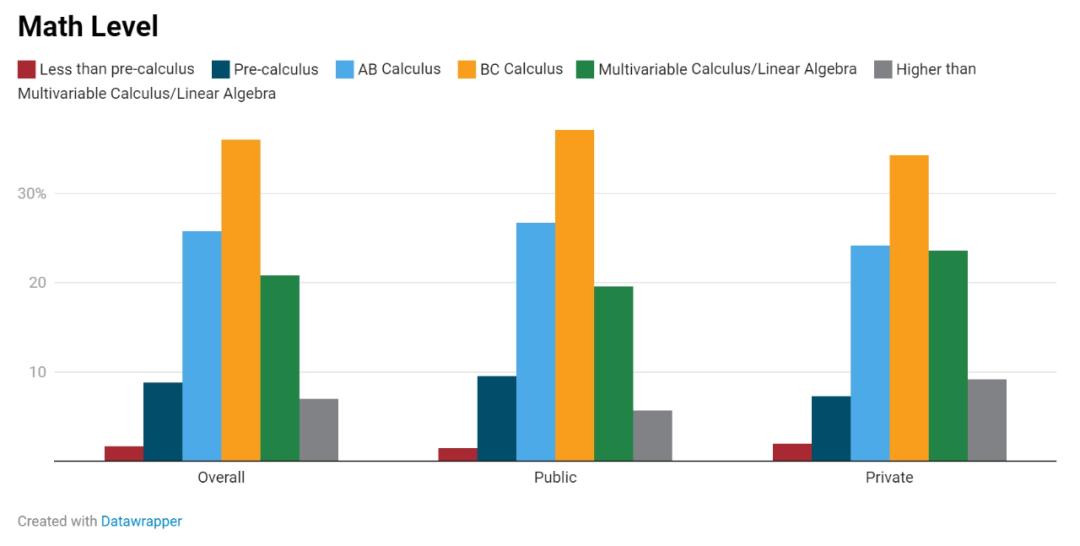 大部分新生都完成了微积分课程还有一部分牛娃完成了微积分以上水平的数学课,私立学校和公立特许学校的比例分别为38%和35%。不过,非特许的公立学校这一比例明显降低,只有25%的学生完成了微积分以上水平的数学课。