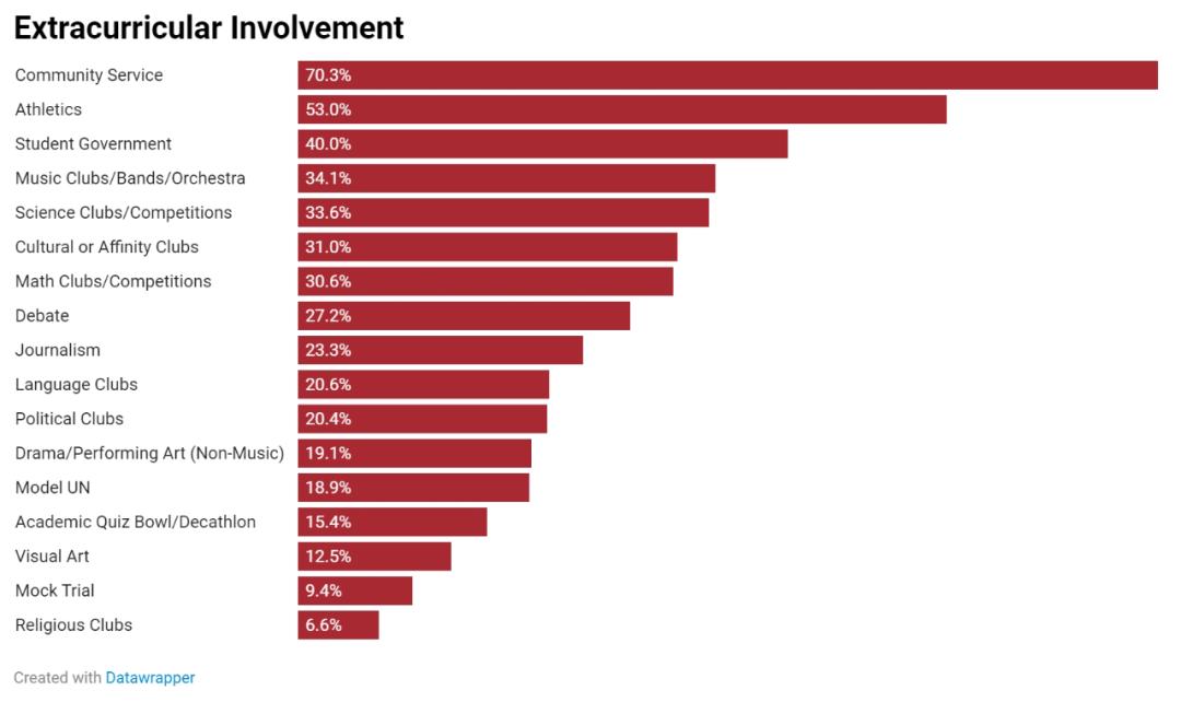 从课外活动上看,新生们也符合典型藤校生的画像:热衷于参加社区服务(70.3%)、参加体育活动(53.0%)、参与学生会(40%)、投入个人爱好,可能是音乐、科学、数学、文化(比例都在30%左右)……