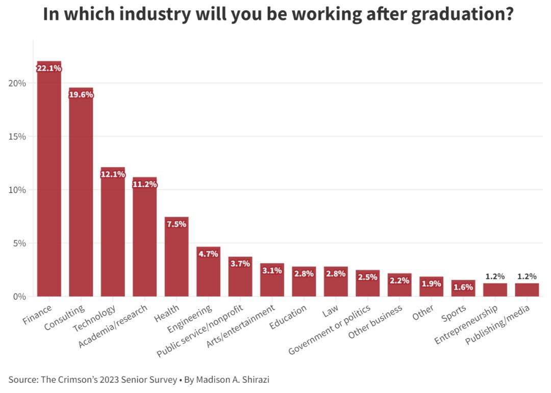 先看一组今年哈佛毕业生的数据:22.1%的学生进入了金融行业、19.6%进入咨询行业,12.1%进入技术行业,只有2.5%的毕业生正在政府或政界谋职。