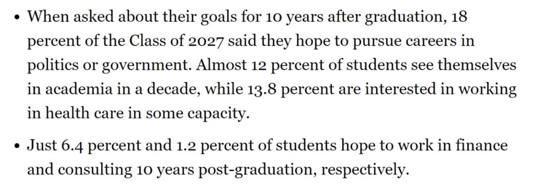 除了这些象牙塔内的内容,这次还调查了新生们的职业发展计划。和哈佛的毕业生报告结合起来看,也让我们从另一个角度看到哈佛精英学子对专业、职业的选择。