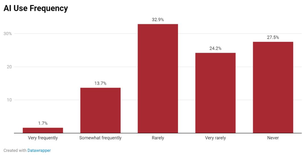 不过,略微有点令人吃惊的是,作为互联网原住民Z一代,学生们对使用AI的态度,相当谨慎。尽管有23%的新生表示,他们在高中阶段就曾使用过人工智能辅助完成高中课程。但总体来说,32.9%的学生表示自己使用AI的频率很低,27.5%的人甚至从未用过。