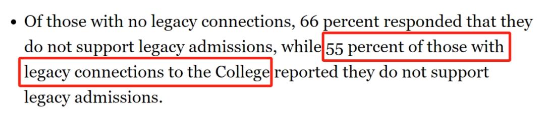 从新生报告的数据上看,超过63%的新生支持取消传承录取。不仅无传承录取优势的学生支持取消,甚至享有传承录取福荫的学生中55%也支持取消。