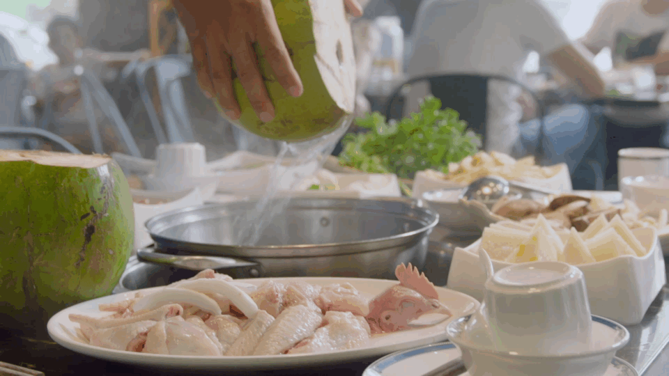 一路西进,云南竹笙和各种山珍杂菌也响应了椰子鸡的号召,在鸡汤里浸润之后,每一个孔洞吸饱了丰腴与清冽;放眼南洋,澳洲肥牛、深海鲜鲍也远渡而来,为椰子鸡添砖加瓦。