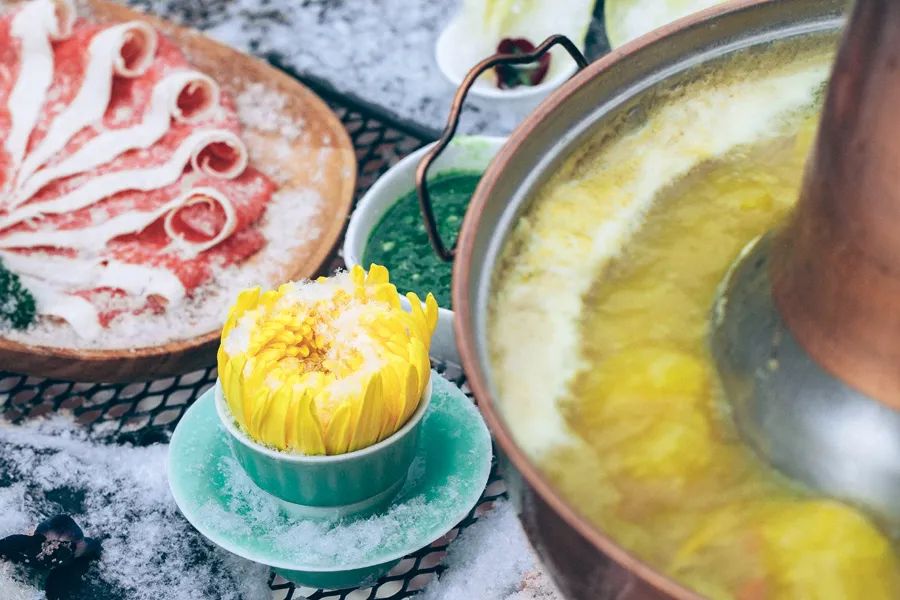 有一日,五柳先生突发奇想:若将菊瓣撒入锅中,会是怎样滋味?于是,他将庭园中盛开的白菊花剪下来,掰瓣洗净,投入锅中,味道果然令人称奇。江浙地区的火锅,秉承了文人温吞的性情。当江边轻轻飘着点儿细雪,就该约上朋友来吃一顿菊花暖锅。