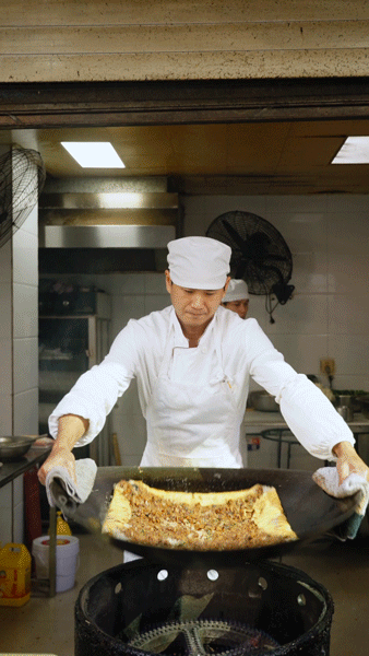 调小火,手拿一把铲子,一边压一边转锅,身体跟着锅的幅度摇摆,细细地把蛋皮煎香,饼皮和糯米紧紧贴在一起。