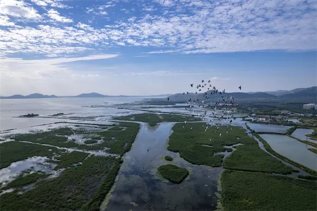 地辽天阔鸟竞飞,平湖薄雾映晴晖。初冬时节,东平湖迎来首批南迁候鸟,它们时而漫步浅滩,时而翱翔天际,动与静、力与美交织,染就一幅舒朗壮丽的天然景象。