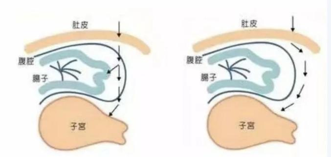 据郑州大学第五附属医院科普,腹膜外剖宫产,就是在腹膜外(术中不见肠管、内脏)切开子宫完成的剖宫产手术。通常剖宫产手术切口的入径如左下图所示,需切开腹膜,这样肠管、大网膜等腹腔脏器同时暴露在术野里,增加了损伤的风险,而腹膜外剖宫产手术的入径如右下图所示,术中把柔软的腹膜及膀胱顶部、部分膀胱后壁与子宫前壁下段分离开来再切开子宫。