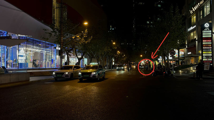 南阳路是一条机非混行的支小马路,道路一侧设有临时停车位,尽管有路灯,但受树荫遮蔽等影响,夜间视线十分受限,十几米外的物体已不太清晰。