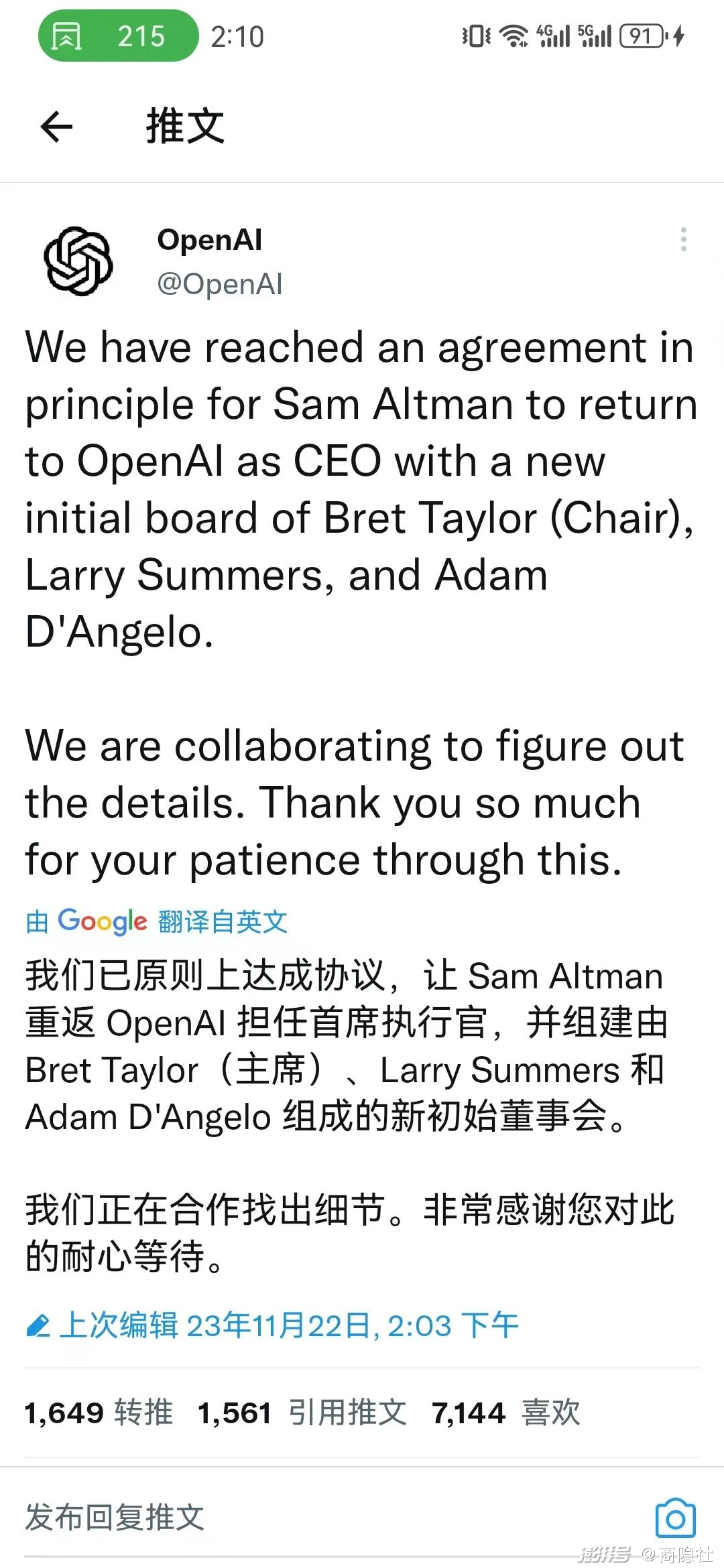 11月22日下午,“OpenAI宫斗大戏”似乎已阶段性落幕。OpenAI表示,已就山姆·奥特曼恢复CEO职务原则上达成一致,山姆·奥特曼将回到OpenAI担任CEO。同一天,奥特曼表示,期待着重返OpenAI,并巩固与微软的牢固合作伙伴关系。