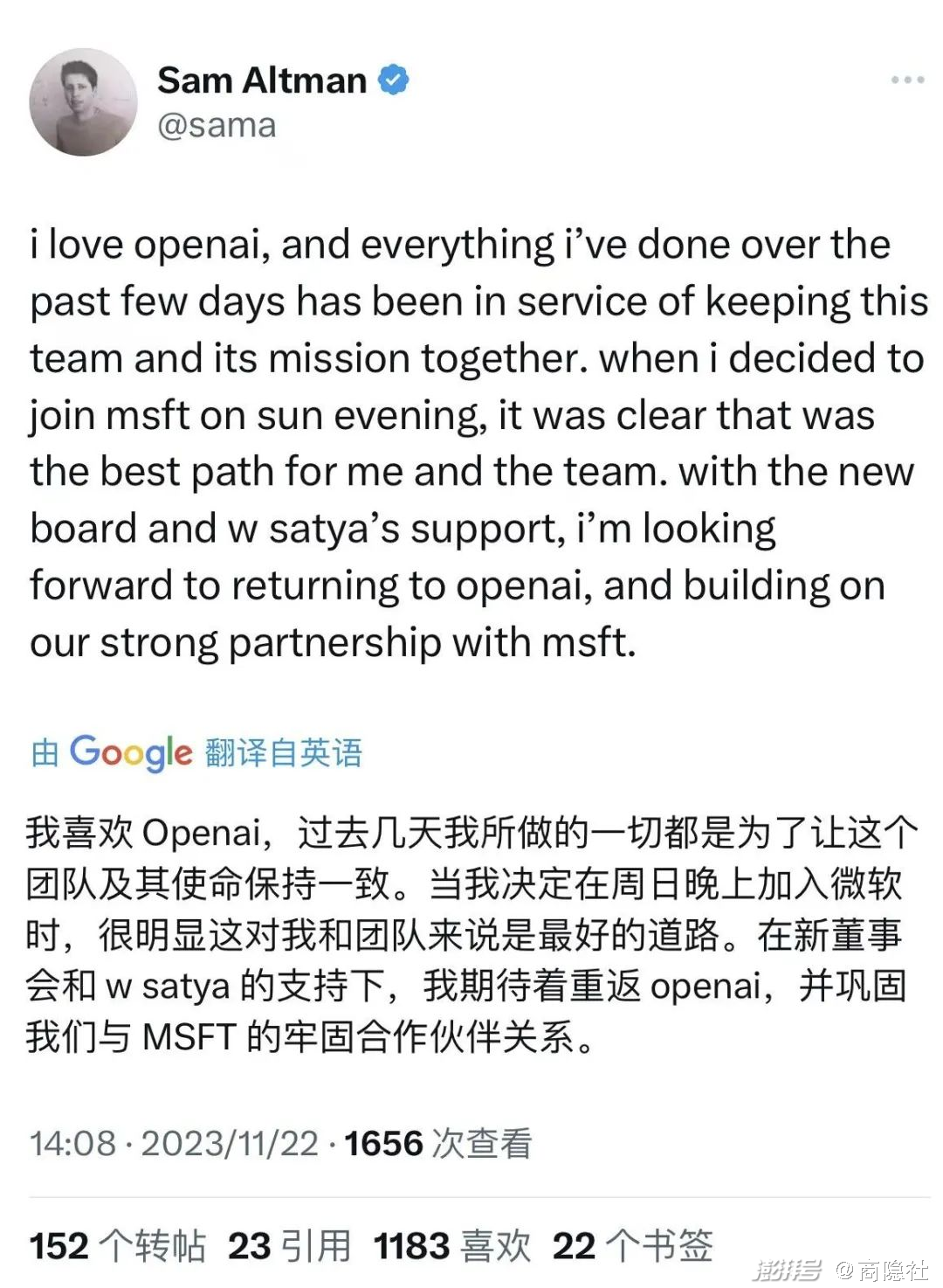 他在这次事件里是受害者。这么厉害的人物,被董事会说开除就开除,还仅提前一天才得知自己被解雇的消息。而支持他的董事会前主席格雷格·布罗克曼(Greg Brockman)则仅提前不到10分钟才得到通知,他也很快公开声明辞职,后跟随奥特曼一起加入微软AI团队。