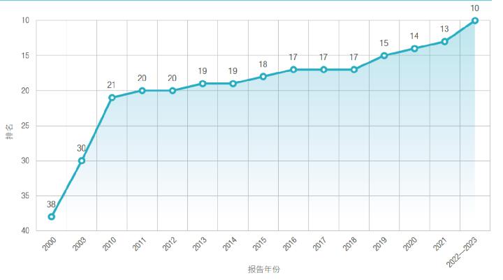 图为近年来中国国家创新指数世界排名变化。(中国科学技术发展战略研究院供图)结果显示,2023年,中国国家创新指数综合排名世界第10位,较上期提升3位,是唯一进入前15位的发展中国家。