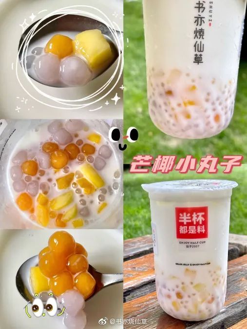 主打“半杯都是料”的奶茶 | 新浪微博@书亦烧仙草尤其是血糯米、青稞、燕麦这类杂粮,更是坐实了“奶茶粥化”的趋势;那种加了很多很多芋泥来打底的奶茶,用粗吸管吸都觉得费劲;甚至有的品牌还打出了“半杯都是料”的slogan,用丰盛的配料量来吸引顾客;还有的品牌会免费赠送配料,除了产品本身含有的配料,还额外提供一两份配料供选,有买有赠,让用户觉得自己真的有赚到。