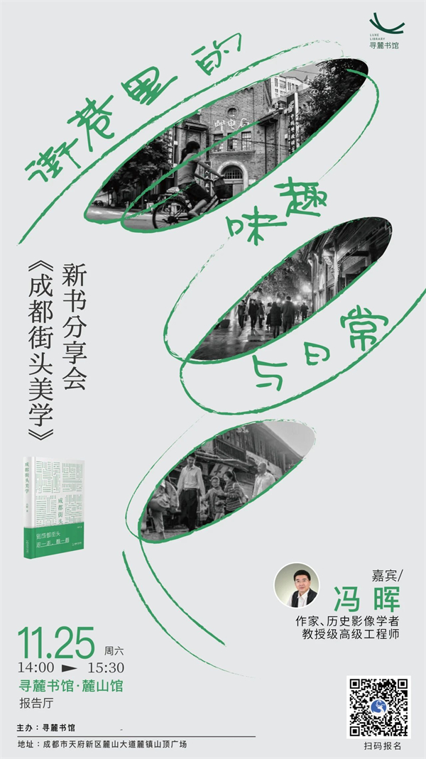 在冯晖老师的新书《成都街头美学》里,他以小街、小店、小亭、小桥、小摊为重点,研究城市街头小空间与普通人日常生活的关系。11月25日下午,我们邀请各位读者跟随作家、历史影像学者冯晖的分享,一起走进成都的街巷和日常,感受这座城市的独特、生动和有趣,重新触摸这座城市的温度和质感。