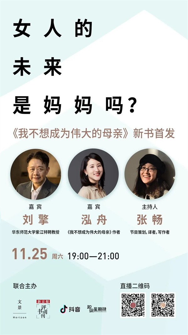 资深媒体人泓舟,从自身的经验与困惑出发,深入访谈了二十多位城市中的女性,写成了一本真切鲜活的母职访谈《我不想成为伟大的母亲》。本书试图记录母亲们普遍面临的困境,描画每一个个体复杂而幽微的特殊故事,并借助社会学的视角,将母亲们进退两难的处境放在不断变迁的社会大环境中进行分析。周六晚,世纪文景联合《新京报·书评周刊》举办《我不想成为伟大的母亲》新书线上首发活动,邀请到华东师范大学刘擎教授、本书作者泓舟,以及节目策划人张畅,共同探讨当代女性成为母亲的困惑、思考与蜕变。这是两位有着不同母职经验的知识女性与一位哲学教授之间的理性对话,也是一次不同性别视角的温柔碰撞。