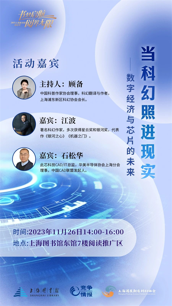 当科幻照进现实,在这个充满未知和可能性的新时代,我们邀请您一起来探讨、一起来分享。一起来见证芯片与数字经济未来的延伸是否会引发碳基生命与硅基生命的共同进化。周日,上海图书馆携手上海浦东新区科幻协会一同举办“科幻三人行·芯片与数字经济的未来分享会”。本次分享会将围绕“芯片与数字经济”这一主题,带您探索AI技术、芯片、元宇宙等热门话题,共同讨论在数字经济时代,我们如何跟上时代的步伐。