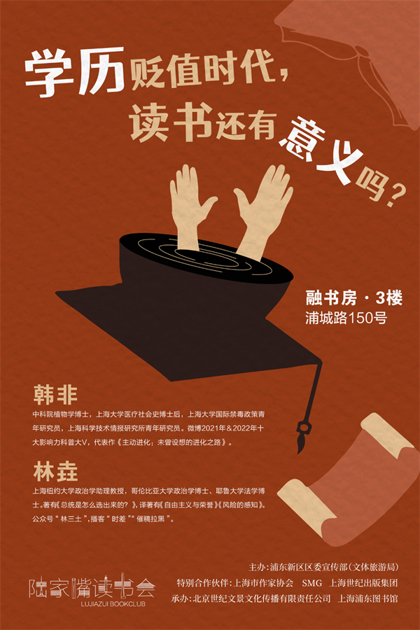 在现在硕士学历越来越普及,博士生越来越扎堆的今天,人们慢慢发现高学历所带来的光环在逐渐消散,而焦虑接踵而至。周五晚,陆家嘴读书会邀请到哥伦比亚大学政治学博士、耶鲁大学法学博士、现任教于上海纽约大学的林垚与中科院植物学博士、微博2021年&2022年十大影响力科普大V韩非来为我们谈一谈学历贬值时代,读书这件事。