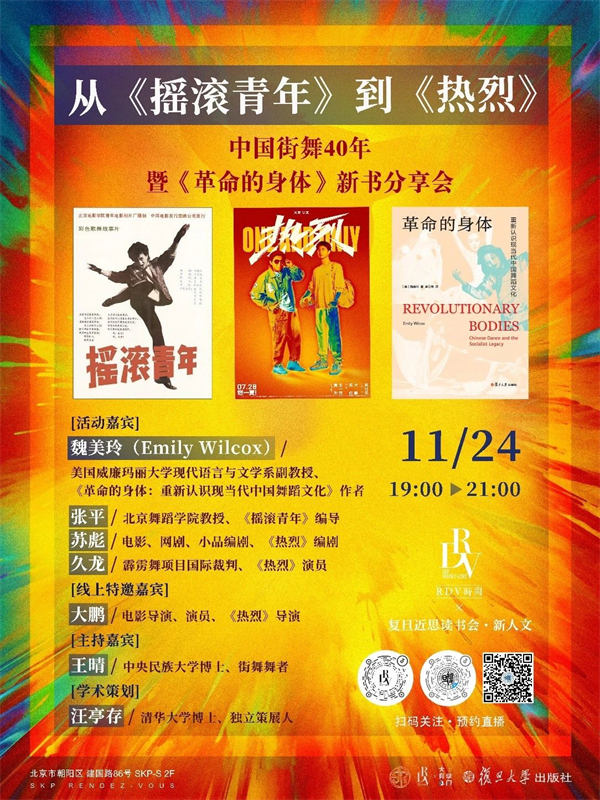 魏美玲(Emily Wilcox)长期从事现当代中国舞蹈和表演艺术研究,她不仅借《革命的身体:重新认识现当代中国舞蹈文化》对20世纪30年代以来中国舞台艺术予以关注,也对改革开放后霹雳舞传入中国发生的“身体的革命”及相关的文化研究议题饶有兴味。2008至2009年,她曾访谈中国首批街舞舞者,其中就有中国街舞类型片“开山之作”《摇滚青年》的编导张平。年度热映街舞题材电影《热烈》则表现了新世纪青年的成长心路,折射出街舞文化在1990年代断裂再出发后,近年被重新“发现”和作为体育舞蹈被认识的演进历程。11月24日晚,我们邀请了美国威廉玛丽大学现代语言与文学系副教授魏美玲,北京舞蹈学院教授张平,《热烈》编剧苏彪,霹雳舞项目国际裁判、《热烈》演员久龙,中央民族大学博士生、街舞舞者王晴,线上特邀电影导演、演员、《热烈》导演大鹏,做客SKP-S,聊聊中国街舞40年,同时分享魏美玲的新书《革命的身体:重新认识现当代中国舞蹈文化》。
